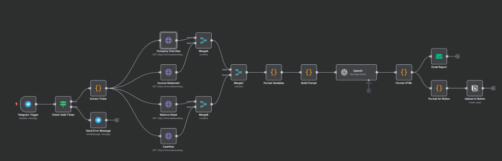 I message a stock ticker (e.g., AAPL) to my Telegram bot. That triggers n8n to: